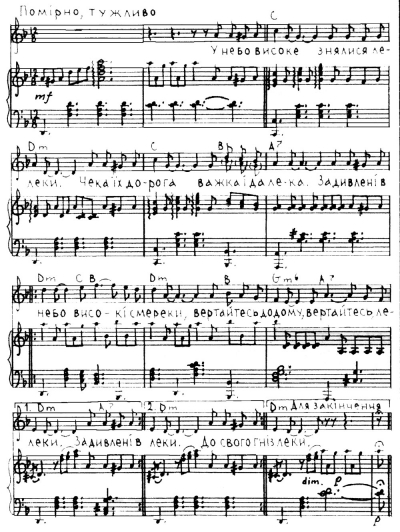У небо високе Знялися лелеки. Чека іх дорога Важка і далека. Приспів: Задивлені в небо Високі смереки, Вертайтесь до дому, Вертайтесь, лелеки. До свого гніздечка На клені старому, Котрий шепче пісню Для вас лиш відому. Приспів: (двічі) |