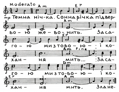 Темна нічка. Сонна річка Під вербою жебонить. За сагою Ми з тобою - І кохання мить. Зла недоля Гнала з поля У чужий далекий край: Ні любові, Ні розмови, Лише твоє: «Прощай...» - Глянь, кохана, Ніч-омана Береже нашу любов! Світла доля, Щастя й воля Поєднались знов! Темна нічка. Сонна річка Під вербою жебонить. Над водою Тінь з журбою Обнялись і спить. |